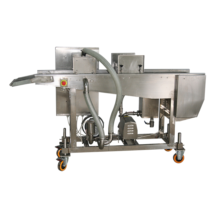 上稀漿機(jī)是通過漿幕和下部的承漿板把漿液均勻粘附在產(chǎn)品上,通過風(fēng)刀時(shí),多余的漿液被吹掉。然后輸入到下一工序。淋漿機(jī)適用于上面包屑和上粉前的工藝。雞塊掛漿機(jī)適合于雞肉、牛肉、豬肉、魚、蝦等海鮮產(chǎn)品,雞塊裹漿機(jī)可以對市場上流行的雞腿,雞排,魚排,漢堡肉餅、麥樂雞塊、魚香漢堡肉餅、土豆餅、南瓜餅、肉串等產(chǎn)品進(jìn)行上漿處理,是食品工廠理想的上漿設(shè)備。