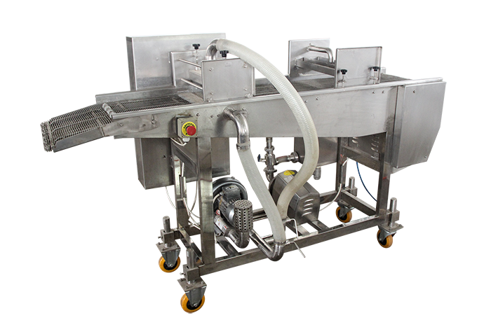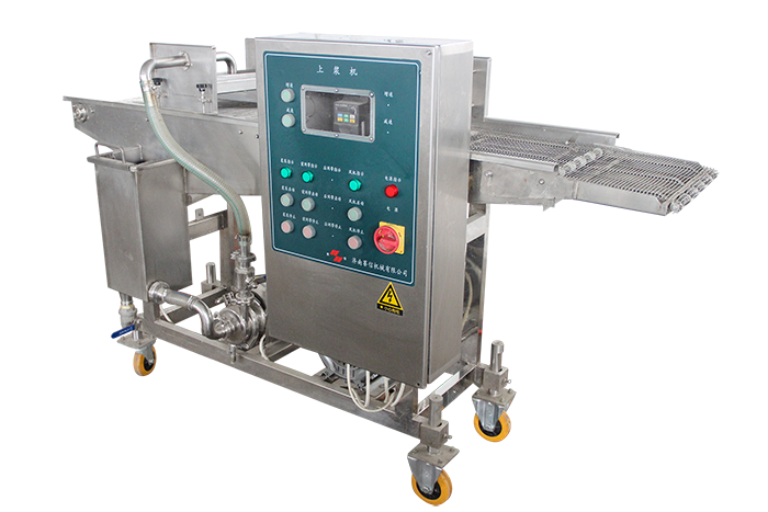 自動(dòng)淋漿機(jī)是通過(guò)漿幕和下部的承漿板把漿液均勻粘附在產(chǎn)品上,通過(guò)風(fēng)刀時(shí),多余的漿液被吹掉。然后輸入到下一工序。掛槳機(jī)可以與成型機(jī),上粉機(jī),上康機(jī) 等不同設(shè)備組成不同的流水線。雞塊掛漿機(jī)適合于雞肉、牛肉、豬肉、魚、蝦等海鮮產(chǎn)品,雞腿上漿機(jī)可以對(duì)市場(chǎng)上流行的雞腿,雞排,魚排,漢堡肉餅、麥樂(lè)雞塊、魚香漢堡肉餅、土豆餅、南瓜餅、肉串等產(chǎn)品進(jìn)行上漿處理,是食品工廠理想的上漿設(shè)備。