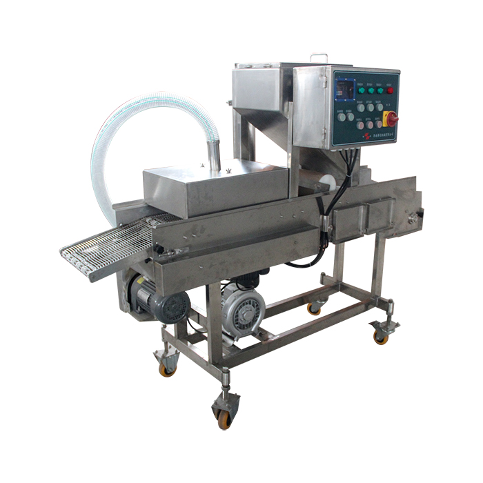 上面包康機(jī)是通過料斗里泄出的面包糠和下網(wǎng)帶上的面包糠將產(chǎn)品均勻涂裹在產(chǎn)品上,經(jīng)壓輥壓緊(上下網(wǎng)帶上的面包屑厚度可以方便調(diào)節(jié)),上康后經(jīng)風(fēng)機(jī),將多余的面包屑吹落。進(jìn)入下一道程序。