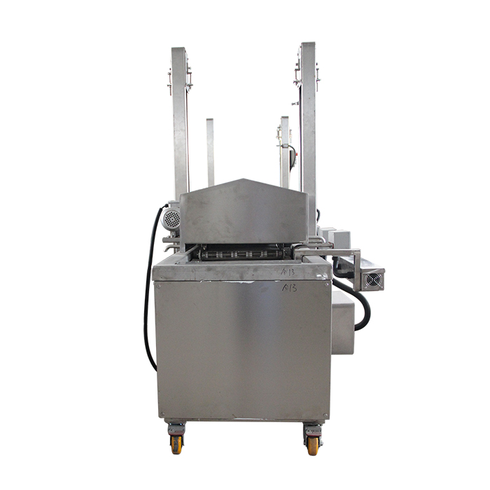 電油炸機是連續(xù)炸物機,食品從機體的進口端輸入后,隨輸送帶在熱油中通過時被油炸熟化,并從機體的出口端輸出。