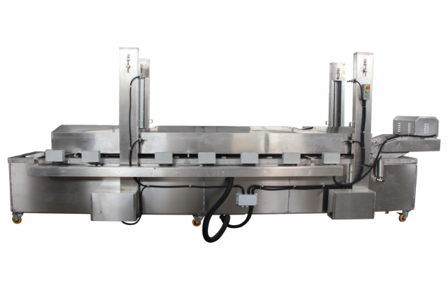 油炸機流水線由網(wǎng)帶輸送系統(tǒng)、自動刮渣系統(tǒng)、濾油系統(tǒng)、網(wǎng)帶提升系統(tǒng)、油溫自動控制系統(tǒng)、電加熱系統(tǒng)等幾部分組成。